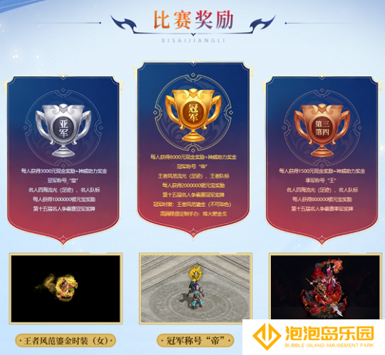 官方为本届名人争霸赛豪掷千万元宝,打造了极为丰厚的奖池。普通赛区冠军战队每人获得10000元现金奖励+神威助力奖金,经典赛区冠军战队每人获得8000元现金奖励+神威助力奖金,另外两大赛区冠军战队还将获得冠军称号“帝”、王者风范流光(足迹)、王者队标、每人获得2000000银元宝奖励、第十五届名人争霸赛冠军奖牌、冠军时装:王者风范鎏金(不可染色)、高端限量定制手办:烽火燃金戈。行走中洲时,尽显荣耀本色。