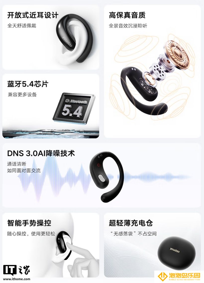 该耳机可选黑白两款配色,采用开放式耳挂设计,支持 DNS 3.0 AI 降噪、低频补偿算法、复合振膜喇叭等,单耳重量 7.8g。